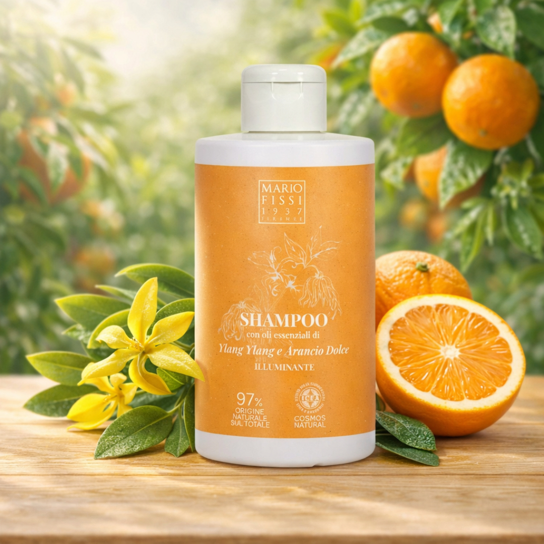 Lo shampoo Ylang Ylang & Arancio Dolce – Mario Fissi 1937 nasce dalla tradizione cosmetica italiana ed è formulato con oli essenziali biologici per detergere delicatamente i capelli, donando luminosità, morbidezza e idratazione naturale🍊🌼.